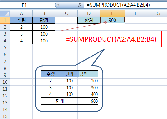 을 구하여 맨아래 금액을 합하여 합계를 내는데요, sumproduct 함수를 이용하면 합계를 구할 E9셀에