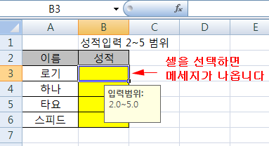 범위는 2~5 입니다. 성적을 입력할때 범위내에서 입력할 경우에는 입력이 되고, 성적의 범위를
