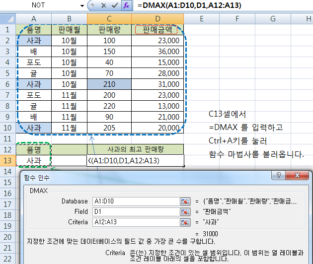 방법도 있습니다. C13셀에서 '=DMAX' 를 입력한 뒤 [Ctrl]+[A]키를 눌러 함수 마법사를 불러옵니다.