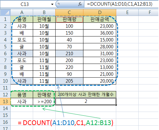 DCOUNT 함수 를 예를 들어보면 아래 표에서 사과 판매량이 200개 이상인 개월 수를 구하는 예를
