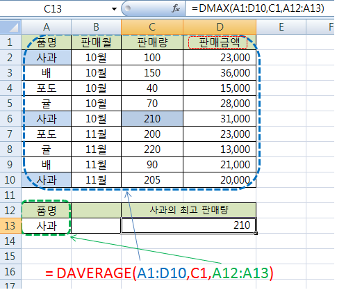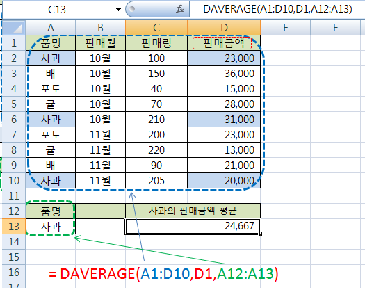 됩니다. 품명이 '사과'를 A1:A10 범위에서 판매금액 필드에서 평균값을 구한다는 의미입니다.