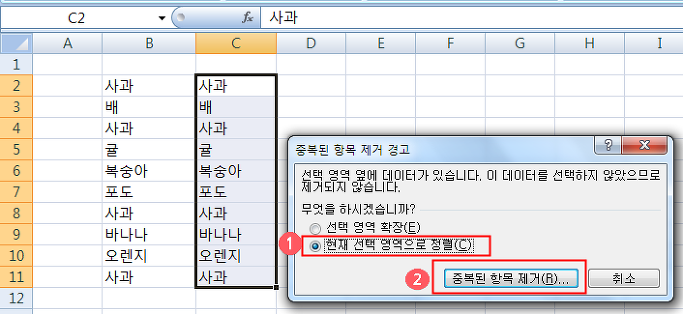 '중복된 항목 제거 경고' 대화상자가 나타나면 영역을 확장할것이니 묻는데요 여기서 B열까지 함께