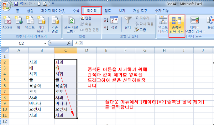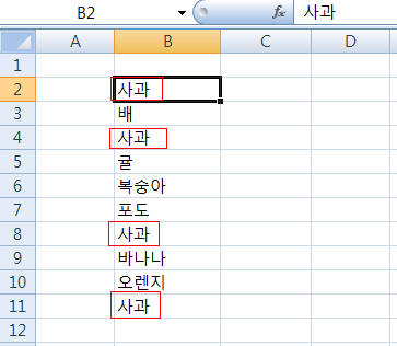 아래 그림에서 항목중에 사과가 4번이나 들어 있는데요 이것을 찾아 중복값을 지워줍니다.