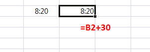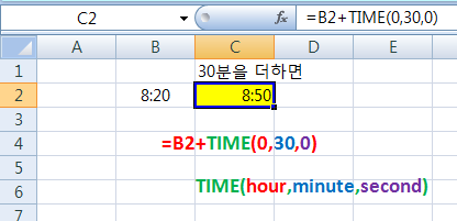 예로 8시 20분에 30분을 경과한 시간을 알아보면 아래처럼 B2셀에 +30을 하여 주면 아래처럼 8:20