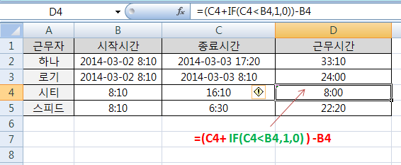 그렇게 해주면 근무시간이 간단하게 계산이 되는데요 위에서 '하나'와 '로기'는 날짜가 있어 계산이