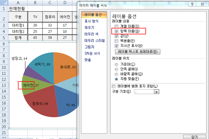 '데이터 레이블 서식' 대화상자에서 '레이블 옵션'에서 '항목이름(G)' 체크하여 줍니다. 그러면
