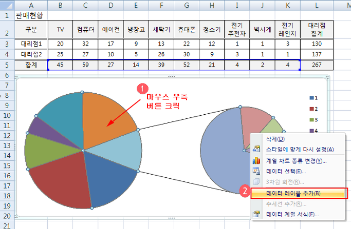 원형차트에서 마우스 우측버튼을 클릭하여 '데이터 레이블 추가'를 클릭합니다.