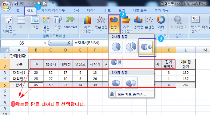 선택은 Ctrl 키를 눌러 항목과 합계를 가지고 원형 차트를 만들어 봅니다.
