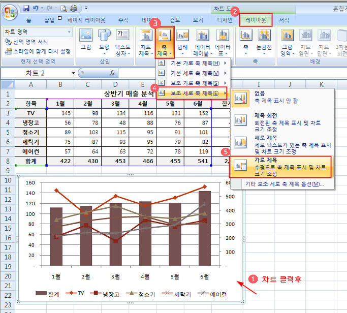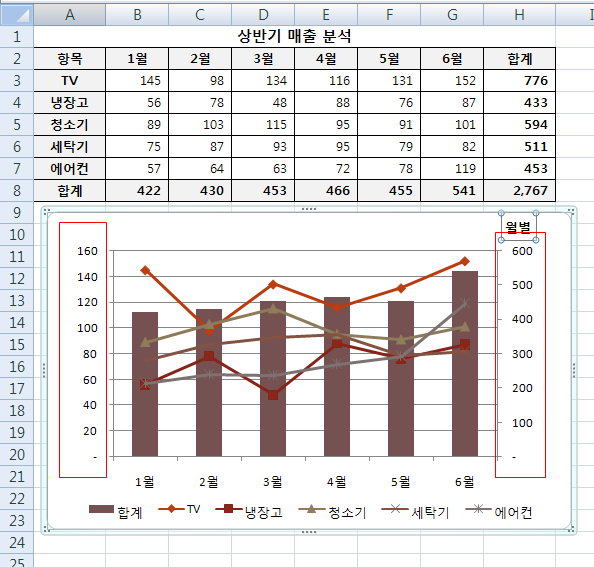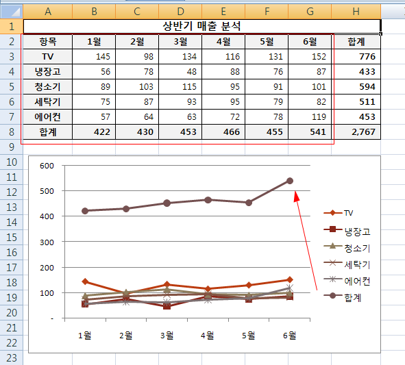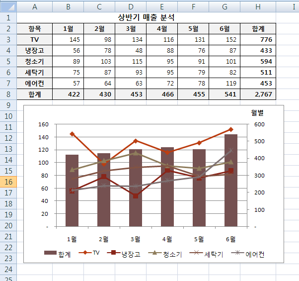 아래 그림은 상반기 매출 분석 도표를 가지고 월별 항목의 매출 차트와 월별 항목들의 합계를
