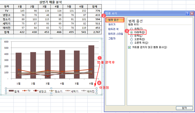 '범례 서식' 대화상자에서 [범례옵션]=>'아래쪽'을 선택하면 범례가 차트 그래프 하단으로 이동하게