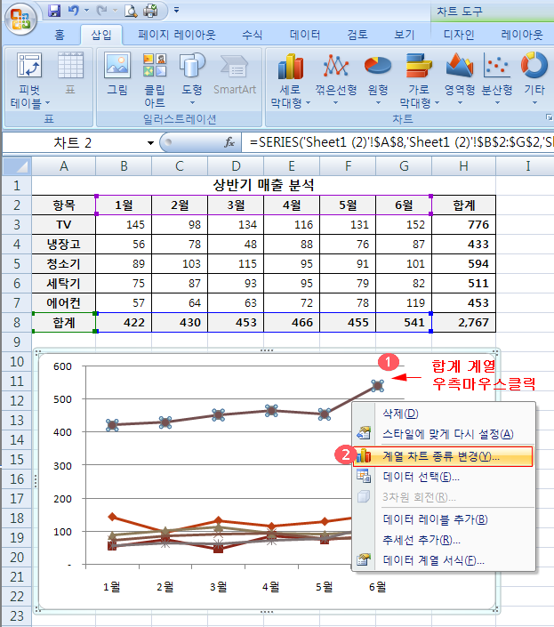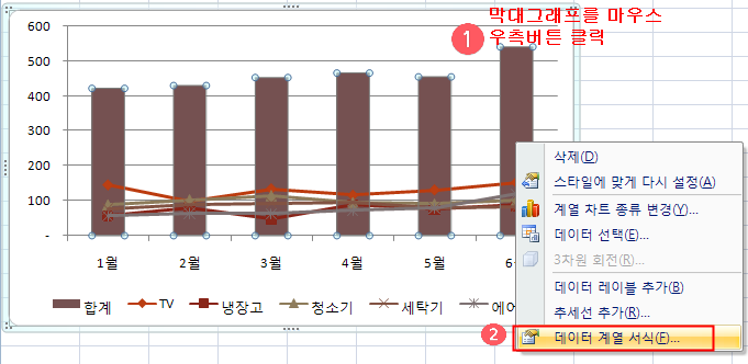 합계 그래프를 막대그래프로 바꿔봅니다. 합계 그래프를 마우스로 선택후 마우스 우측 버튼을