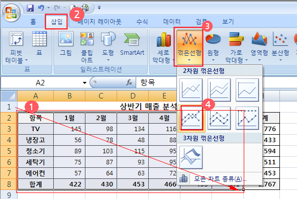 먼저 아래 예제 매출분석 도표를 이용해 꺽은선 그래프이 차트를 먼저 만듭니다.