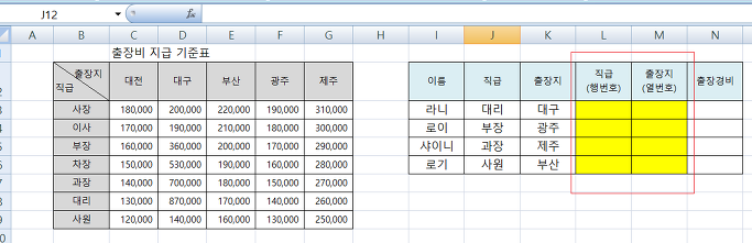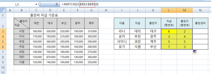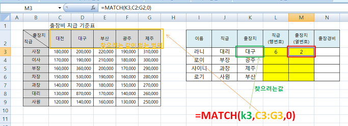 또한 열번호(출장지)의 값을 찾아 열번호를 반환하여 표시하기 위해서는 M3셀에서 '=match(k3, c3:g3