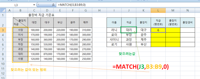 먼저 직급(행번호)를 찾기 위해 L3셀을 클릭한후 '=match(J3, B3:B9, 0)' 이렇게 입력합니다.