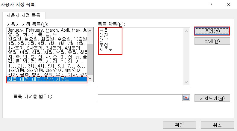 더 쉽게 설명을 드려서 엑셀 작업 중에 "서울, 대전, 대구, 부산, 제주도"를 일렬적으로 사용하는 빈도수가 높을 때 사용할 수 있습니다. 또는 학교 선생님이 자주 사용하는 과목이 있다면 "국어, 영어, 수학, 중국어" 이렇게 일렬적인 데이터를 입력할 때 설정할 수 있는 기능입니다. 그렇다면 아래 예제를 보면서 설명을 드리도록 하겠습니다.