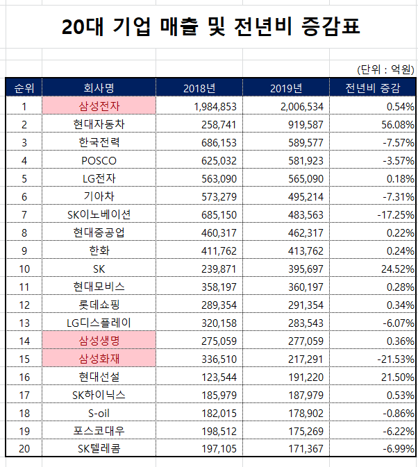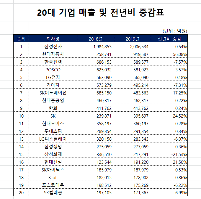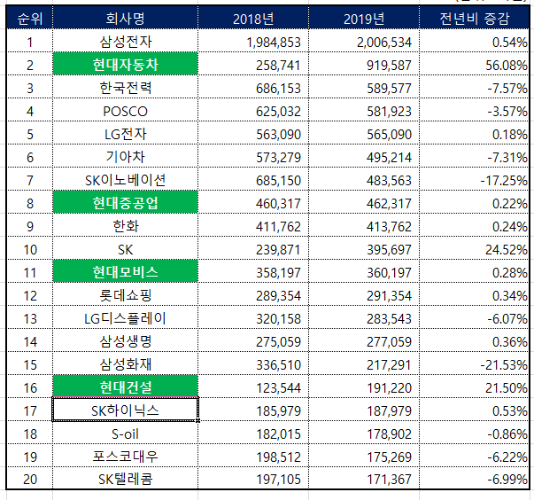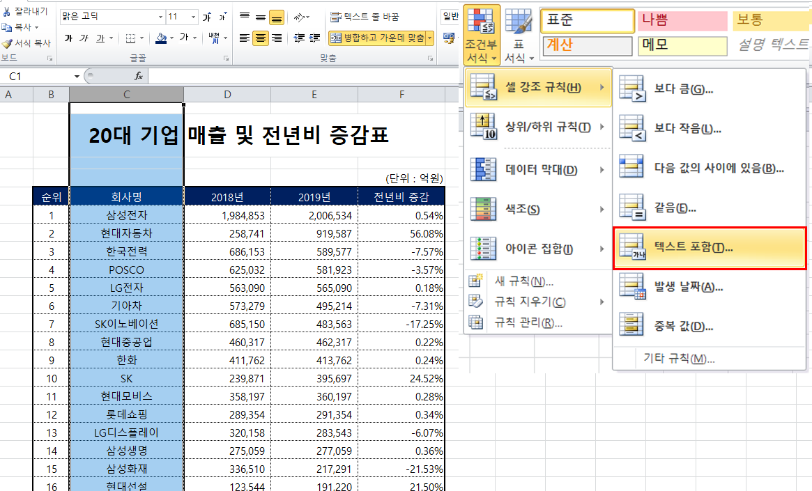 위에 예시를 설명드리겠습니다. 20대 기업 2018년, 2019년 매출액 및 전년비 증감에 대한 데이터를 만들었습니다. 이 데이터를 가지고 특정 기업 '삼성 또는 현대' 특정 단어가 포함된 셀 서식을 적용하려고 합니다. 그럼 아래 적용 예시를 핱번 설명드리도록 하겠습니다.