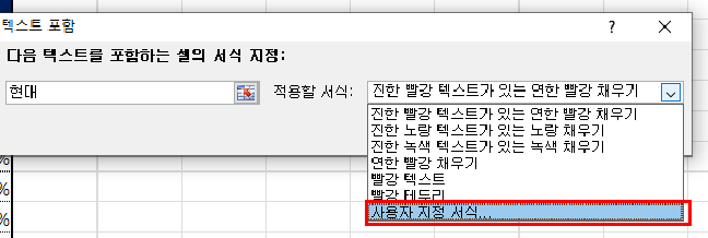 저는 엑셀 색깔인 초록색 채우기에 글꼴은 굵게, 흰색으로 설정을 한 후 확인을 눌렀습니다. 그리고 조건은 '현대' 텍스트가 들어가 있는 셀로 조건부서식 지정을 했습니다. 그리고 확인을 누르면 아래처럼 '현대자동차, 현대중공업, 현대모비스, 현대건설' 총 4개 기업에 셀 적용이 됐습니다. 엑셀 조건부서식 텍스트 어렵지 않죠?