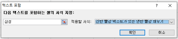 텍스트 포함에 들어가게되면은 적용하고자 하는 단어 넣는 부분과 적용할 서식 부분이 있습니다. 전 우선 '삼성'이 들어간 텍스트 셀을 찾아서 '진한 빨강 텍스트가 있는 연한 빨강 채우기' 서식을 적용하려고 합니다. 위에처럼 적용한 후 확인을 누르면 어떤 결과값이 나타날까요?
