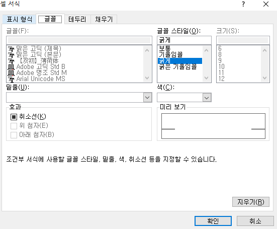어렵지 않습니다. 아까 위에대로 '텍스트 포함'에 들어가시면 '적용할 서식'에 '사용자 지정 서식'이 있습니다. '사용자 지정서식'을 누르면 '셀서식'이 나타나고 표시형식, 글꼴, 테두리, 채우기를 설정하셔서 적용하시면 됩니다.