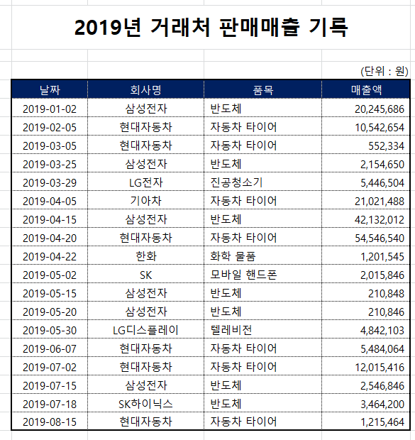 2019년 거래처 판매매출 기록을 가지고 예시를 해보도록하겠습니다. 전 회사명 중복값을 찾아보려고 합니다. 당연히 조건부 서식을 적용할 데이터는 회사명 또는 C열이겠죠?