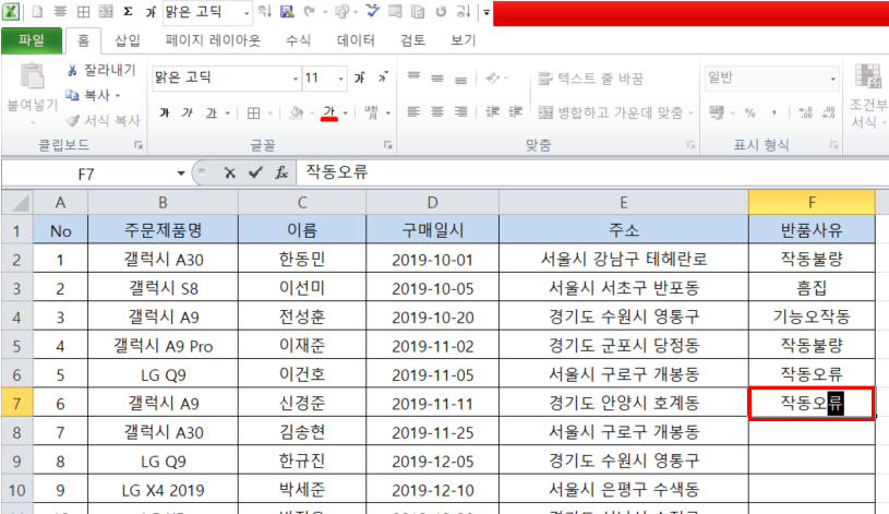 위에 예시를 보시면 제가 설명드리려했던 말이 바로 이겁니다. 반품사유에 '작동오류'라는 텍스트를 입력하고 싶은데 첫번째 사진을 보면은 미리 작성한 '작동불량'이라는 텍스트가 자동완성되서 활성화된것을 볼 수 있을 겁니다.