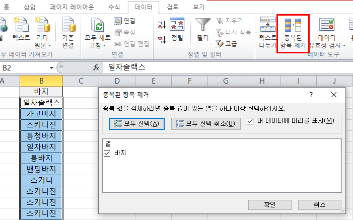 전 바지 종류를 중복값을 제거하고자하니 위와 같이 데이터를 선택하겠습니다.