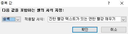 조건부 서식에 '중복값'을 선택하면 '다음 값을 포함하는 셀의 서식 지정'이라는 창과 함께 위와 같은 창이 나옵니다. 적용할 서식은 자신이 원하는 조건에 맞게끔 설정 한 후 확인을 누르면 됩니다.