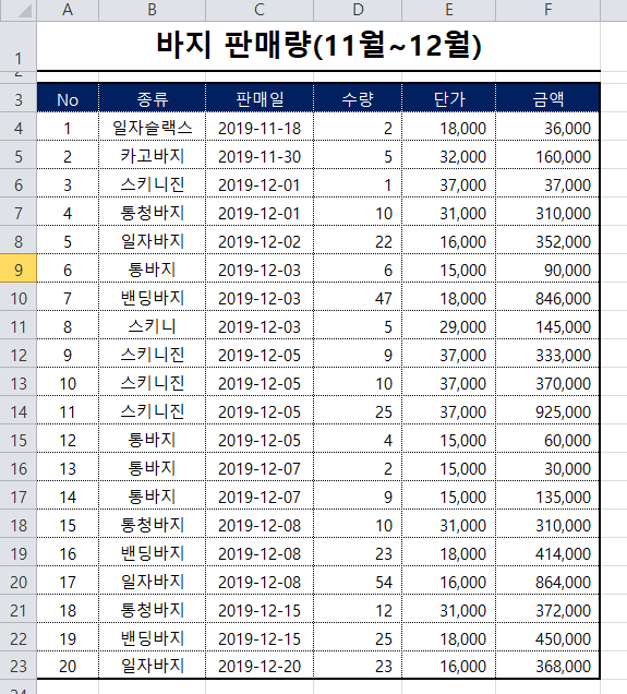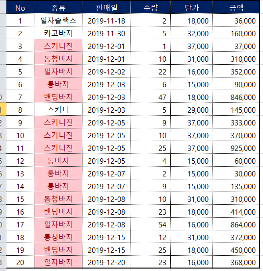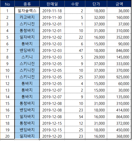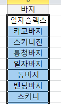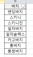 많은 사람들이 엑셀 중복값 제거를 왜 하는진 모르지만 전 대부분의 이유가 고유 데이터의 값을 추출하기 위해서기 때문에 쉽게 보기 위해서 정렬이 필요합니다. 위처럼 일자슬랙스~스키니 순을 밴딩바지~통청바지 순으로 ㄱ~ㅎ으로 정렬을 했습니다.
