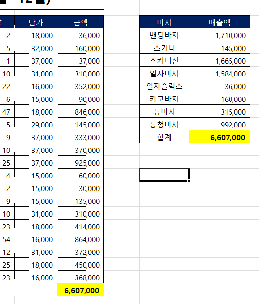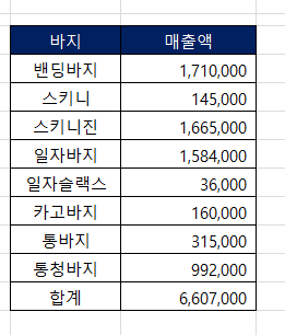 어떤 종류에 바지가 얼마나 팔렸는지를 알아내고 싶습니다!