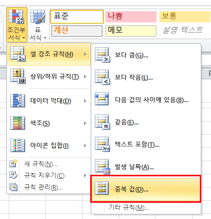 두번째, 우측 상단에 조건부 서식에 들어가 '중복 값'을 선택합니다.