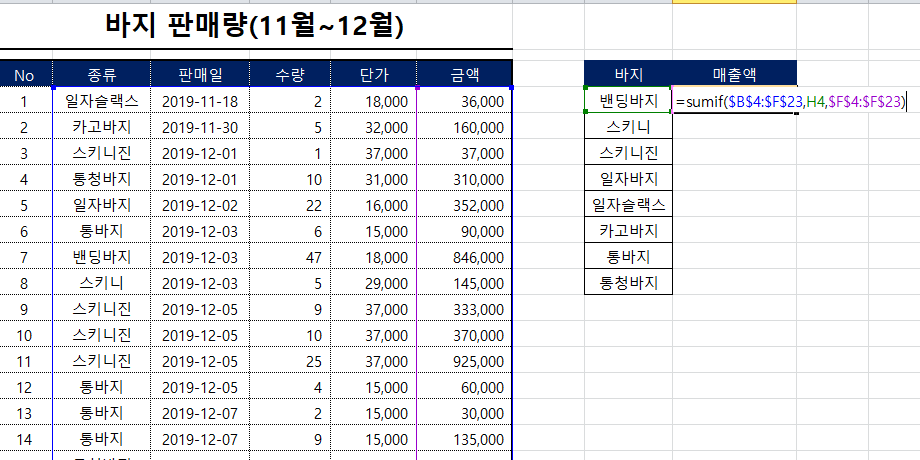 네번째, SUMIF 함수 적용하기