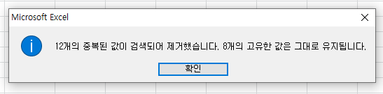 '12개의 중복된 값이 검색되어 제거 했습니다. 8개의 고유한 값은 그대로 유지됩니다'라는 결과값은 즉, 20개의 데이터가 있었는데 중복값 12개를 제외한 고유의 값 8개가 남았다는 겁니다.