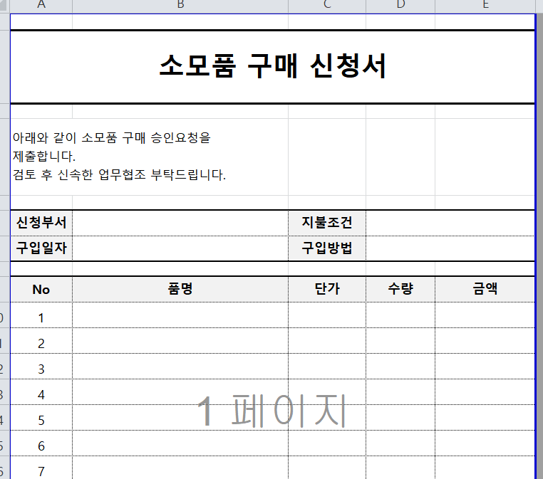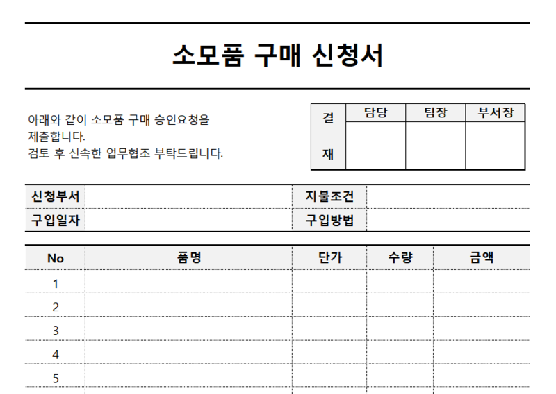 전 소모품 구매신청서 타이틀 우측 하단에 결재(담당, 팀장, 부서장) 결재란을 넣을겁니다. 위에 있는 결재란을 만들기 위해 행과 열 조정을 한다면은 아래 있는 데이터들이 틀어져버릴 수 있습니다. 즉, 결재란을 만드는건 다른 데이터가 입력된 행, 열의 크기를 건들지 않는 상태에서 진행을 해야 합니다. 여기서 필요한게 바로 엑셀 그림 붙여넣기 기능입니다. 굉장히 쉬우니깐 아래 설명을 드리겠습니다.