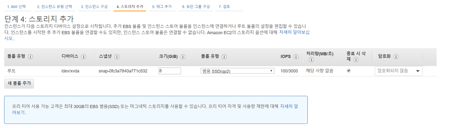 또한 볼륨 유형에 따라 비용의 차이가 있는데, 여기서는 기본 값인 범용 SSD를 선택합니다. ( EBS 볼륨유형, 비용 )