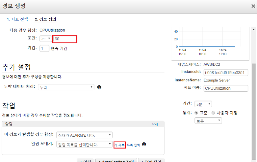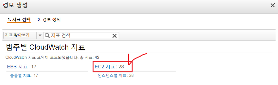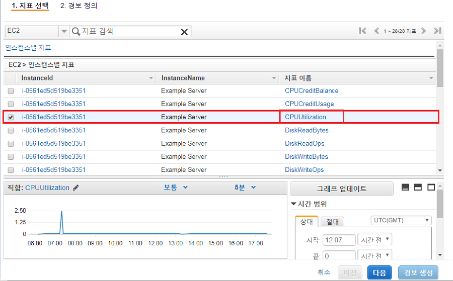 따라서 지표 이름 중 "CPUUtilization"을 선택하여 "다음"버튼을 눌러주세요.