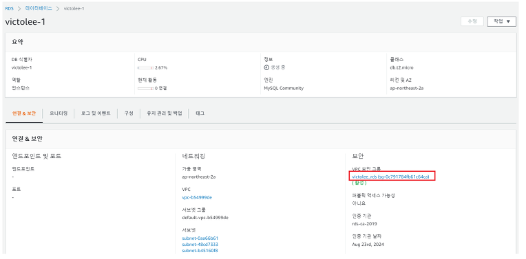 생성된 인스턴스를 클릭하면 나오는 상세정보에서 VPC 보안 그룹을 클릭합니다.