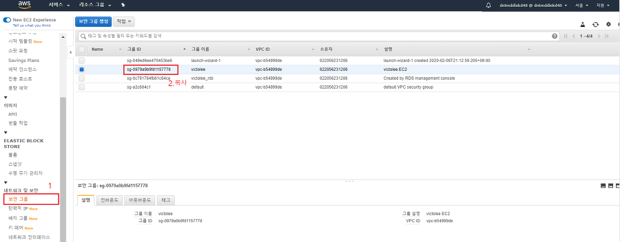기존에 생성된 EC2의 보안그룹의 그룹ID를 복사합니다.