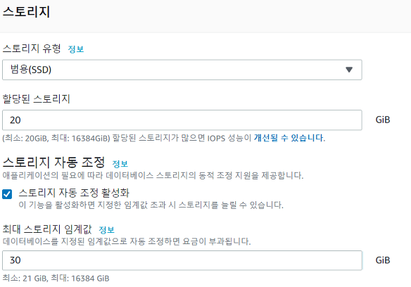 최대 스토리지 임계값은 해당 DB 인스턴스가 자동으로 확장할 수 있는 제한 값입니다.