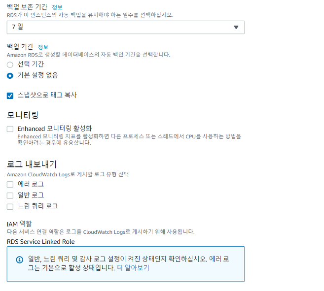 RDS 스토리지 Auto scaling에 대한 추가 비용은 없기 때문에, 활성화를 해줍니다.