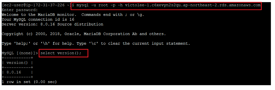 EC2에서 다음의 명령어를 실행하여 RDS 인스턴스에 접근합니다.