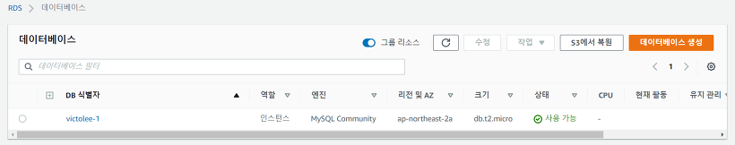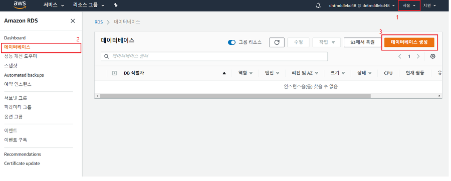먼저 서울 리전을 선택한 후, 데이터베이스 생성 버튼을 클릭합니다.