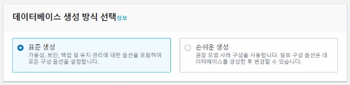 손쉬운 생성을 선택하면 DB 엔진만 골라서 인스턴스를 생성할 수 있으며, 추가적인 설정은 인스턴스 생성후 변경할 수 있습니다.