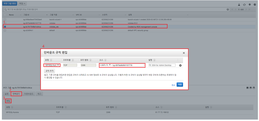 EC2에서 RDS 인스턴스에 접근하려면, 보안 그룹을 수정해야 합니다.