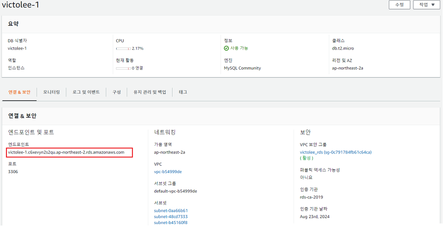 다음으로 RDS 인스턴스의 엔드포인트를 확인합니다.