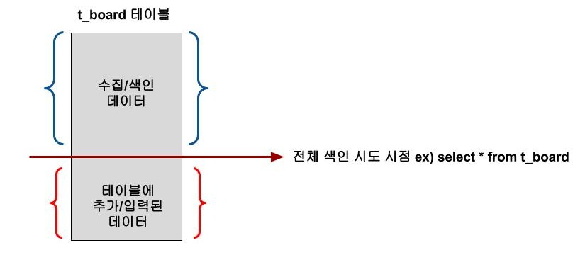- 데이터 수집 대상 테이블에 추가/입력되는 데이터가 있다면 색인 시도 시점 이전에 입력된 row 갯수 만큼 데이터 수집/색인 작업 진행