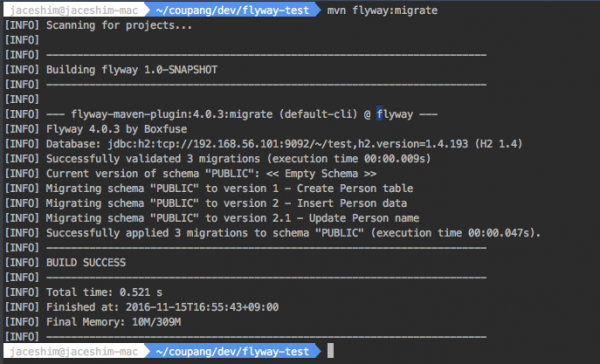 - console에서 migration 실행mvn flyway:migrate 를 실행하면 db/migration 하위에 .sql파일들이 version에 따라 실행됨을 확인 할 수 있다.