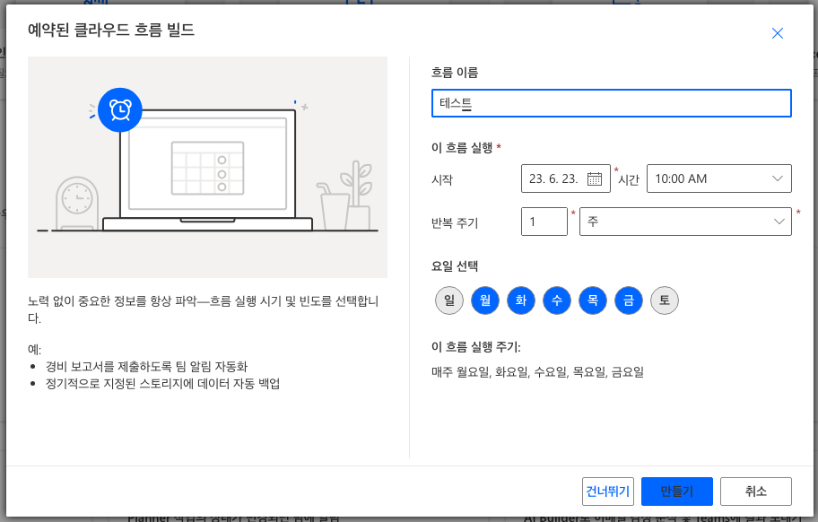 "예약된 클라우드 흐름" 클릭