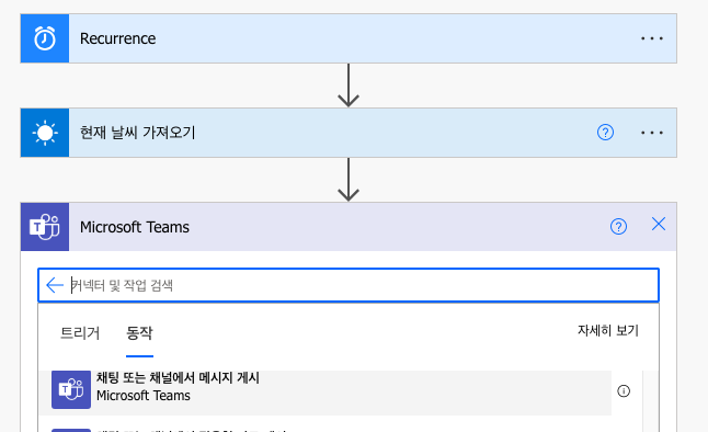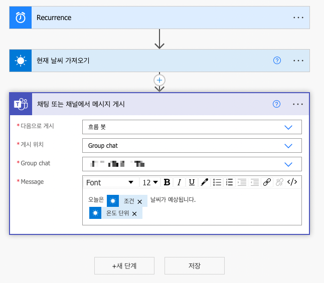 새 단계를 클릭하여 팀즈의 "채팅 또는 채널에서 메시지 게시" 를 선택합니다.