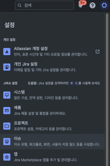 설정(톱니바퀴) 클릭 후, 이슈 버튼 클릭