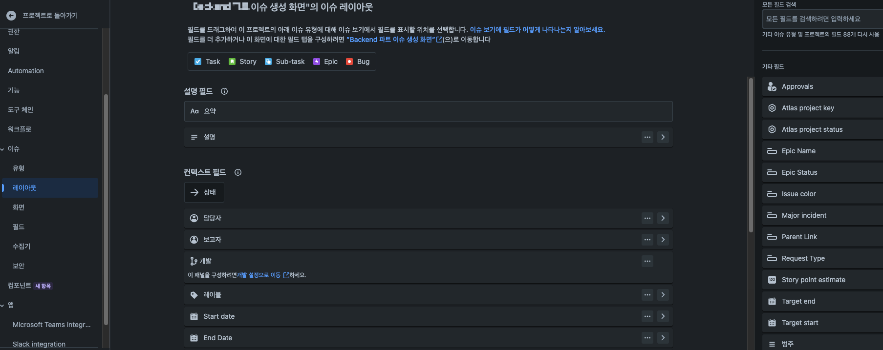 프로젝트 설정 - 이슈 - 레이아웃